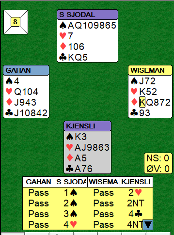 Sjødal-Kjensli meldte 6 spar etter en fin meldesekvens. Nøkkelen til slemmen er syds 4 kløver - cuebid - og at nord var med på notene med kontrollmelding i hjerter. Ved det andre bordet gikk det likt, men den engelske jenta sa 4 spar. Hun turde kanskje ikke kontrollmelde med singelton i makkerens hjerterfarge. Det er en makkerskapsavtale, skal man gjøre det, eller ikke. Jeg liker at man kan gjøre det, for andre ganger kan syd være søkklastet i alle andre farger, men ha noe sånt som QJ-femte i hjerter, og da er hun helt avhengig av å høre kontrollmeldingen i hjerter for å kunne melde sparslem.