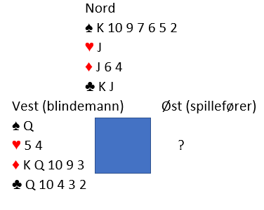 Som nord hadde jeg åpnet med 3 spar og øst gikk inn med 4 hjerter. Starten på motspillet var spar ess fra syd, toeren fra nord som Lavinthal, og syd skiftet til kløver ess og mer kløver til kongen, øst fulgte to ganger, så forsvaret har allerede tre stikk. Hva ville du gjort nå:
