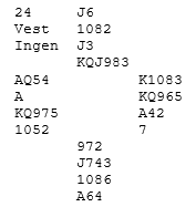 Ruter ess kom i utspill fulgt av spar 10 i skift. Blindemann vant det stikket, og nå ble det spilt kløver fra vest som nord stakk med esset. Nå blir det bet om nord skifter til trumf. Øst må ta for esset for å ha igjen to trumf til å stjele ruter med, men da får syd to trumfstikk med K-10 bak østs dame. Men nord trodde kanskje makkeren hadde singel spar og fortsatte med den fargen til østs ess. Så ruterstjeling, kløver til stjeling og nok en ruterstjeling. Begge ruterstjelingene ble tatt med små trumf, og så kunne han seile hjerter knekt rundt, og forsvaret kunne ikke få mer enn ett trumfstikk. Dermed ble det +620 til Ø/V ved det bordet, og utgang begge retninger ga lederlaget 14 IMP.