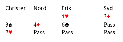 Berg (nord) åpnet med 1 kløver og Christer sa 1 hjerter som viser spar (kløverføringer). Vest hoppet inn med 3 hjerter, pass fra Berg og 4 hjerter fra øst.
