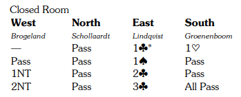 Brogeland meldte 1 grand over østs gjenåpnig med 1 spar. Over 2 kløver prøvde vest 2 grand, og nå hadde han fortalt sin historie nokså bra, synes jeg. Lindqvist trodde ikke på utgang, og det stoppet i en sunn delkontrakt. Med for eksempel AQJ-sjette i kløver tror jeg han ville løftet til 3 grand. Det ble tapt spill denne gangen selv om vurderingene var fornuftige nok.