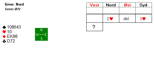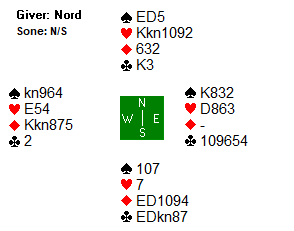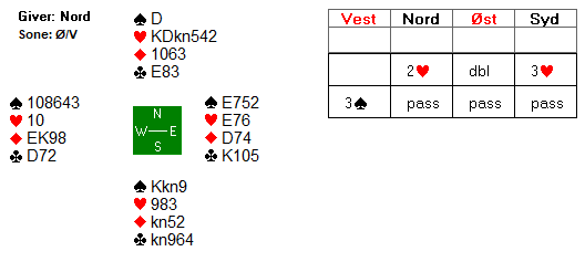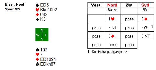 Å si 4 hjerter direkte som syd tror jeg er feil om avtalen er "standard", at det viser kun en svak hånd med veldig mange trumf. Et sånt hopp bør være innefor et ganske smalt styrkeintervall, for hvis det kan være nesten ingenting med fem-seks trumf en gang og en bra hånd neste gang blir det umulig for åpneren å vurdere om han har en sterk hånd. Hvis man spiller med minisplinter er det kanskje en aktuell melding (3 kløver), men hånden er såpass sterk at syd vil i utgang uansett. Kanskje er det nok til å vise en minimum Splinter hånd, 4 kløver (for eksempel). Som sagt, mye avhenger av system og avtaler, men også av av syds vurdering av kortene. Det er en syvtapers hånd i hjerterkontrakt, og et pluss kan ofte være mellomkortene i ruterfargen som kan gjøre at den fargen lettere kan godspilles (om kortene er annerledes). Altså, gode grunner til ¨å være optimistisk. Jeg har foreløpig ikke fått fatt i Flått-Bakke sitt meldingsforløp (så denne artikkelen kan blir oppdatert serene i dag), men de var altså alene om å notere meldt og vunnet slem, 13 IMP til Norge mot utgang ved det andre bordet.
