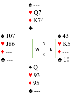 Nå spilte Høyland spar ess og spar til håndens konge. Syd viste seg å ha trumfstikk (QJ9 fra start). Høyland tok for kløver 10 og kastet en hjerter. I det stikket trumfet syd og spilte hjerter 3.