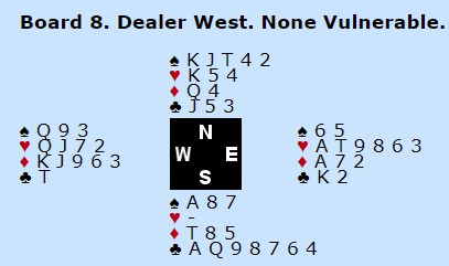 Kløverfargen må fiskes selv om mange vil vurdere å topp med ti (beste sjanse med ti kort til sammen uten kongen). Sparfargen bør også fiskes (det er også beste sjanse med en slik sparfarge, åtte kort hvor man mangler damen). Agnethe vant kontrakten og noterte +550 som var verd 11 IMP som birdro til at SOFIES WORLD tok en fin ledelse etter de første fjorten spillene.