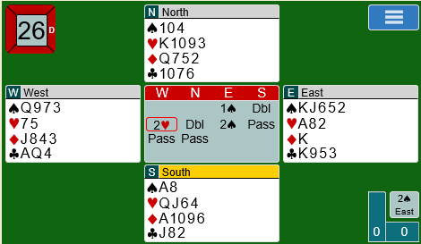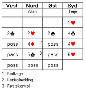 Vest har nok ikke begge essene fordi hun da ville åpnet på 1-trinnet siden hun allerede er markert med dame-knekt i hjerter.