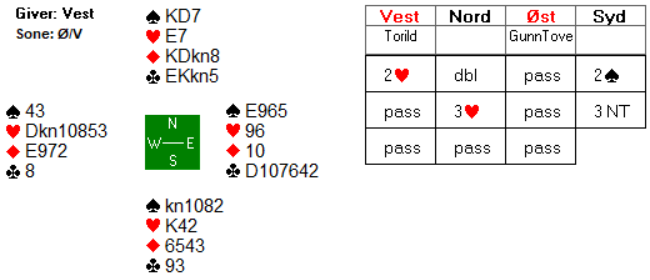 Det var nettopp slik spillet ble innledet der Torild Heskje og Gunn Tove Vist spilte imot. Etter at hjerter dame fikk beholde første stikk, så Torild at det ikke lenger var mulig å få godspilt farga da makker er markert med maksimalt to kort i farga. Hun skiftet til spar 4. Spillefører stakk med kongen, men Gunn Tove lasjerte. Deretter fortsatte spillefører med ruter konge til Torilds ess. Torild spilte så sin siste spar. Den ble stukket med dama i bordet, og Gunn Tove lasjerte nok en gang. Neste trekk fra spillefører var ruter dama, og sursitsen kom for en dag.