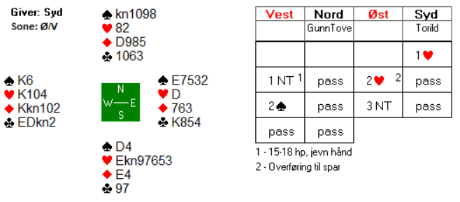 Spillefører hadde åtte stikk (2+1+1+4), men det niende stikket manglet. Det var ikke andre steder å sette det opp enn i ruter. Dermed måtte Gunn Tove slippes inn på dama. Hun kunne så forsyne seg med to sparstikk for ei beit i kontrakten.