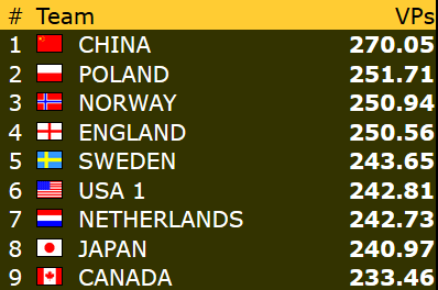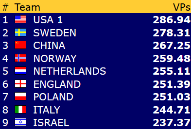 Etter dagens andre kamp kan vi glede oss over tre norske storseire! I både åpen klasse og dameklassen er Norge godt innenfor topp 8 med tre gjenstående kamper. Men det gjelder å holde oppe dampen helt inn! Det skader heller ikke å ha litt å gå på før morgendagen. Damene skal møte lederlaget Kina og Frankrike, som ligger på 12.plass, mens laget i åpen klasse også har lag på øvre halvdel igjen i morgen. Da skal de opp mot Australia (11.plass) og Hong Kong (12.plass).