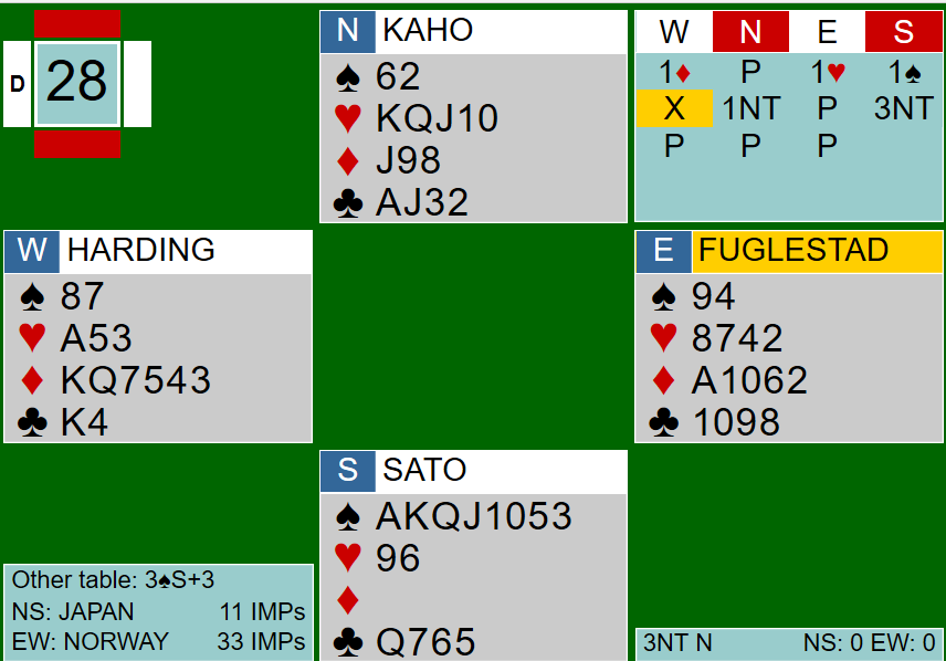 Japanerne havnet altså av alle ting i 3 grand etter at nord først meldte 1 grand uten å ha ruterhold, og syd så bestemte at grand var tingen med 7-4-fordeling!