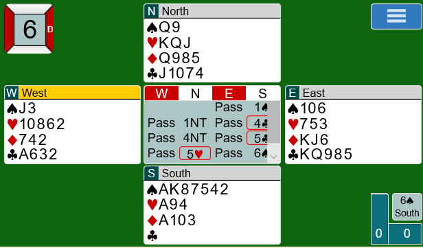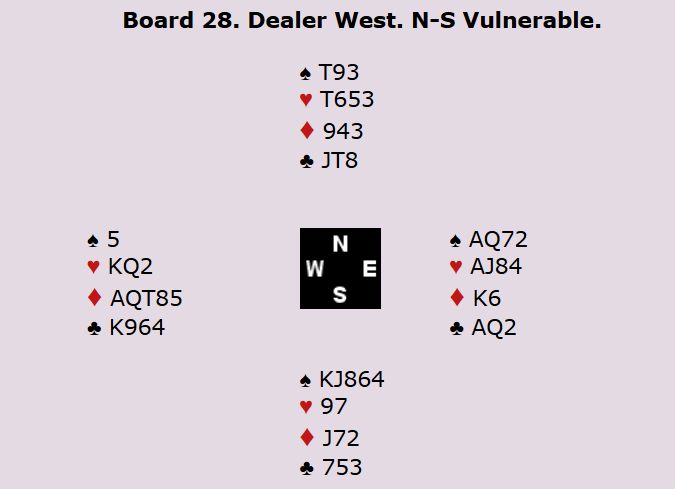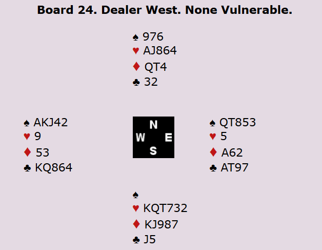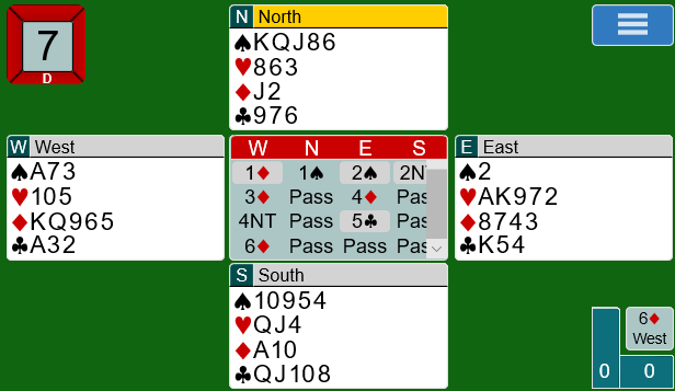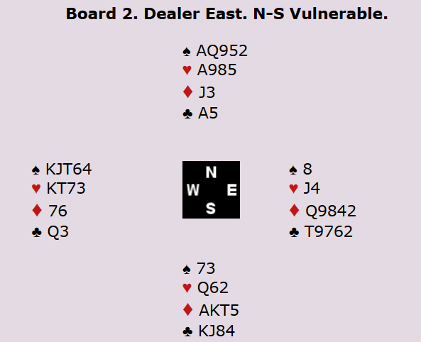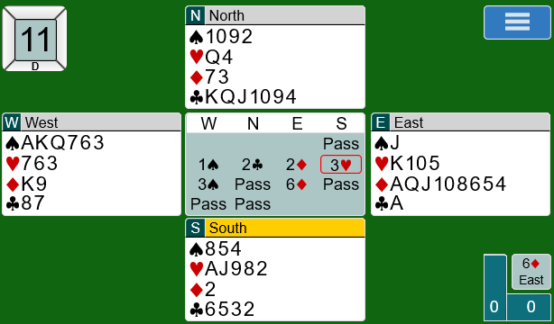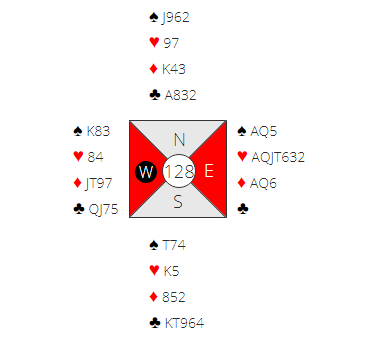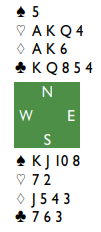 Merk at det er essensielt å ha kontrakten på østs hånd for å beskytte hjerter konge, men om man først kommer i ruterkontrakt er det vel grunn til å tro at øst blir spillefører.