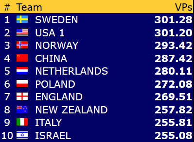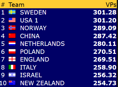 Norge meldte ikke slemmen hverken i åpen klasse eller dameklassen, men begge lagene vant likevel 8 IMP for å spille 5 ruter da det ble spilt 3 spar udoblet med tre sonebeit nord-syd.
