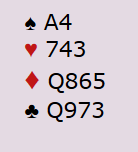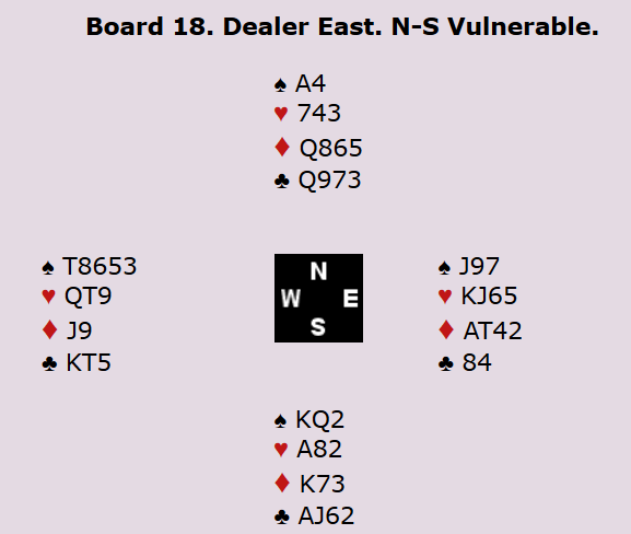 Den vanligste kontrakten var 4 spar spilt av vest. La oss si du får hjerter ut fra nord til esset på hånda. Det er naturlig å fortsette med en spar til knekten. Om syd lasjerer denne, kan det være at han greier å skape enn illusjon som får deg til å ville gardere deg mot at nord har 4-korts spar. Om du samtidig er redd for å pådra deg ei trumføyning imot, kan det tenkes at du ender opp med en rutertaper, en kløvertaper og to trumftapere.