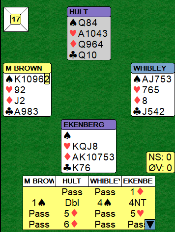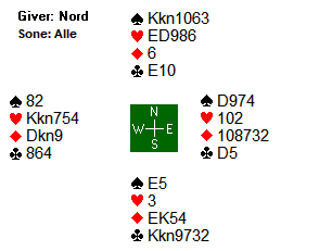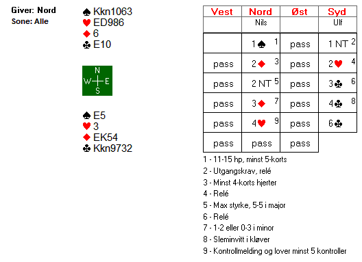 Mot Terje Aa (V)- Allan Livgård (Ø) meldte svenskene Rimstedt (O. i N og M. i S) slik: 1 NT fra Syd, 2 kløversøk (Stayman) fra Nord og svar 2 hjerter fra Syd. 3 kløver fra Nord var trolig gjentatt søk og svaret 3 NT lovte dermed 2-4 i major. Da Nord så meldte 4 ruter var det klar sleminvitt og Syd cue- bidet 4 hjerter (1./2. kontroll) før Nord brukte 5 ess Blackwood og da svaret 5 kløver kom kunne Nord avslutte med 6 grand. Det er den beste kontrakten som alltid vinnes. Hva skjedde så ved det andre bordet der Boye Brogeland (Syd)- Espen Lingqvist (Nord) møtte svenskene Nystrøm (V)- Upmark (Ø)? Jo det startet med 1 NT fra Syd og svar 3 kløver (alertert) fra Nord som var en spesialkonvensjon og 3 ruter fra Syd. Før 3 NT og 4 ruter fartsatte trumfen. Etter 5-ess BW- søk ble bare 4 ess avdekket og kontrakten derfor lagt i 6 ruter. Bra det også- men ikke i dette tilfellet. Hvorfor? Jo hj 9 kom ut til Øst sitt ess og så ny hjerter som Vest kunne stjele. Hjerterfargen satt virkelig 5-1 imot og en sonebet mot 1440 ut ved det andre bordet kostet nordmennene 17 imp. Sverige vant kampen 87-21.