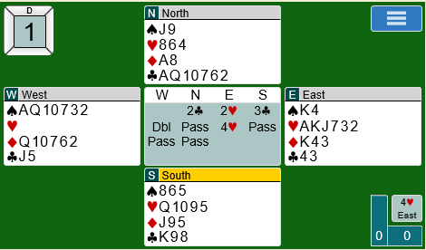 For tilskuerne som fulgte BBO- sendingen fra kampen så dette dårlig ut, er det mulig å vinne mer enn 4 stikk og -800? Ø-V har knapt nok utgang, 3 NT den veien betes om ruter kommer tidlig i spill og 4 hjerter vinnes bare med dobbeltfinesse i trumf. Så til spillet: