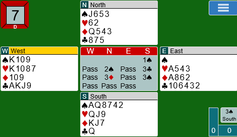 Fortsettelsen ble hjerter til knekten som holt og så spar ess og spar knekt som Syd vant med kongen.Ruter 10 kom så til konge og stjeling av Nord med sp dame. Kl K kom i retur og Espen måtte bare stikke direkte. To stikk tapt og ingen inngang til bordets gode ruterstikk gjorde situasjonen prekær, men spillefører fant løsningen. Espen forsynte seg med tre stikk til i trumf og før siste trumf var stillingen slik (etter naturlig saking fra Nord og Syd).