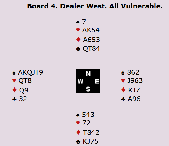 Den israleske spilleren spiltye i stedet spar til finesse. Han håpte nok på 4-2 med Dx eller Kx i Nord. Det vil bare gi en taper i trumf, men her holt ikke den planen og det endte med 1 bet. 12 imp til Norge.