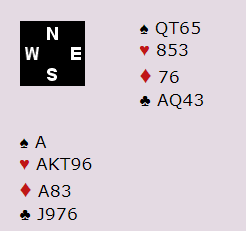 Jeg tror det riktige er å fastslå at makkers litt uventede utspill er en singelton omtrent hundre av hundre ganger. Hvorfor vil han ellers blindt spille ut en umeldt farge etter at egen side har meldt og støttet hjerter? Det var overaskende å se at mange på syd sin plass forsøkte en stor hjerter da de var inne på trumfesset. Da føk kontrakten hjem i full fart siden hele spillet så slik ut: