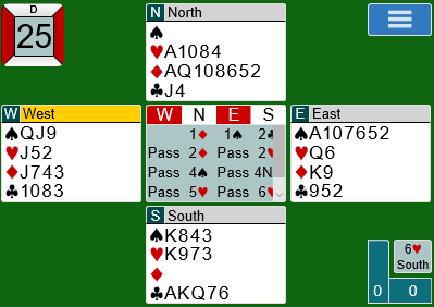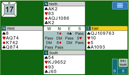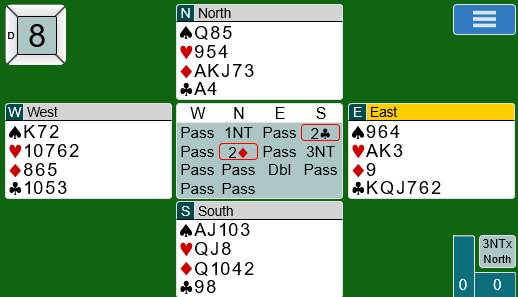 La oss si meldingene går omtrent slik: 1 hjerter fra syd, 1 spar fra vest, 3 hjerter fra nord, 3 spar fra øst, og vest avslutter meldingene med 4 spar over syds 4 hjerter. Ett sted gikk meldingene 1 hjerter (syd), dobler fra vest, 3 hjerter fra nord, dobler fra øst (!), 4 hjerter fra syd og 4 spar fra vest med pass rundt.