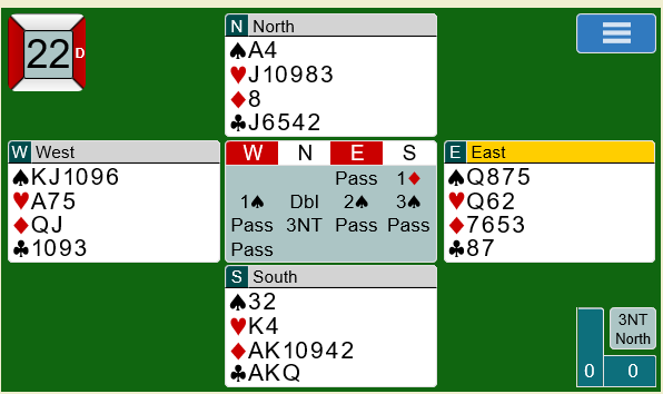 Utspillet gikk via tieren i øst til Peters ess. Han fortsatte med ruter ess og ruter 10 til knekten. Begge motstanderne fulgte farge. Deretter fulgte kløver 9, som gikk til kongen og esset. Vest spilte tilbake ny spar. Inne på kongen tok Peter for ruter dame før ruter til kongen fulgte. På den siste ruteren kastet vest en kløver. Da Peter innkasserte toppstikkene i hjerter kom knekten på fra øst andre gang. På tredje runde saket øst en spar. Dermed var det klart at vest hadde stopper på hjerter 9.