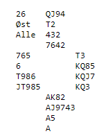 Vi som fulgte sending på BBO så at hvis Øst klarer å starte med ruter og dermed ta to stikk må Allan etterpå gjette rett i hjerter for å vinne. Men da Øst valgte å spille ut kl J kom claim av 10 stikk ganske fort. Ut-trumfing og på 5. kløver ble var Alexs sak av ru 10 på hånden. Dermed alltid 10 stikk, 11 om hjerteren gjettes rett. +10 imp til Norge som til slutt vant oppgjøret med 9 imp. Close race altså!