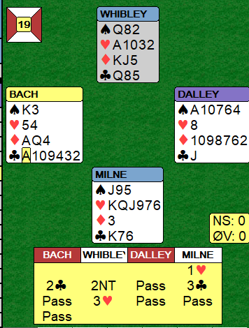 De tok altså ikke de fem første, men det ser ut som om det ikke koster noe, for spillefører har kun ett avkast for spar. Milne så imidlertid en mulighet da han vant for kløver konge i fjerde stikk – en innspillsmulighet. Han kjørte igang med trumfene sine, og slik så det ut før den siste (merk at spillefører har latt ruter K-J ligge hos blindemann uten inntak):