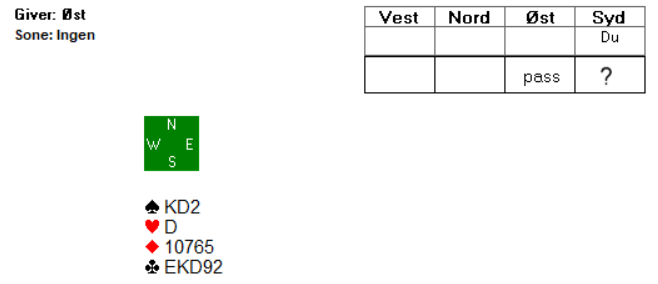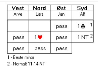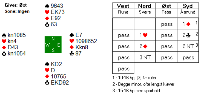 Sverre åpne<t i Norzd med 1 ruter som var ubalansert og normalt 4+ i fargen. Pass fra Øst, og Åsmund meldte 1 spar. Nord gjenmeldte 2 ruter, som regel viser det 6-kort og 10-14 hp. Etter to passer kastet Vest seg så inn med en opplysende dobling, ville kjempe og kontrakt med sine 10 hp.Øst forsøkte seg med 2 hjerter og Åsmund regnet med at Sverre var kort i spar så dermed slo han til med en dobling. Etter to ganger pass fikk Øst kalde føtter og meldte 2 spar, men det var å gå fra asken til ilden! 2 spar doblet skulle bli en dyr affære.