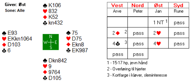 2 ruter var overføring til hjerter og 4 kløver viste minst 6-kortsfarge i hjerter, kortfarge i kløver og sleminteresse. Hva ville du meldt i øst over 4 kløver?
