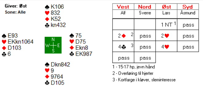 Både Jan Mikkelsen og Lars Eide valgte å melde 4 hjerter. Dermed ble det endestasjonen. Når vi ser øst og vests hender mot hverandre, er dette en slem man gjerne vil være i: