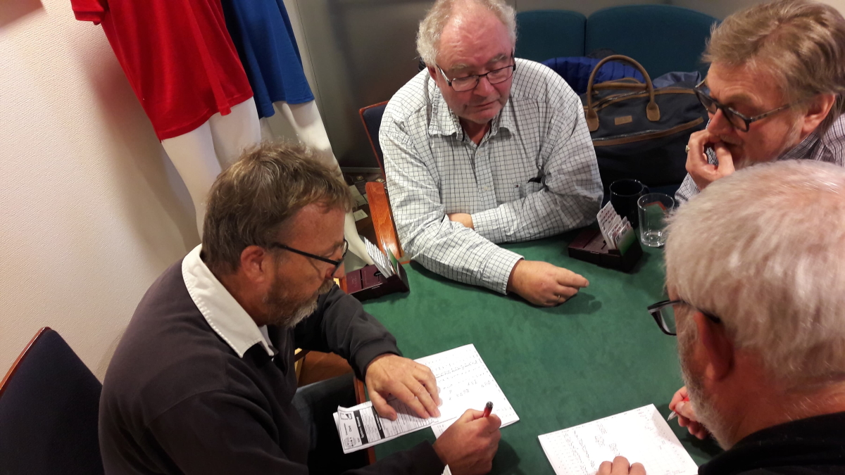 Etter første dag av kvalifiseringa til neste års EM for veteranlag leder lag Johnsen (Sverre Johnsen, Åsmund Stokkeland, Jan Mikkelsen og Arve Farstad) med IMP-sifrene 91-73 over lag Anderssen (Rune B. Anderssen, Peter Marstrander, Lars Eide og Alf E. Anderssen). Dermed er det hele nokså åpent før de 32 siste spillene i morgen. De to siste settene spilles henholdsvis klokka 10 og 12 søndag. Som tidligere lovet skal vi ta et tilbakeblikk på et par av spillene fra dagens siste sett.