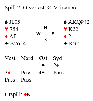 Poenget er litt det samme som i det førstnevnte spillet. Nord må holdes utenfor, for om han kommer inn truer spar gjennom kongen kontrakten. De som vant med kløver ess og tok ut trumfen gikk bet i 5 hjerter siden nord fikk komme inn idet ruterfargen ble godspilt. Ett ruterstikk og to sparstikk til N/S ga en bet.