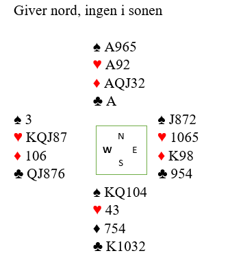 Begge på syds plass var i 4 spar. Der Håkon Kippe var spillefører hadde vest (Våge) meldt inn 2 hjerter etter 1 ruter (nord) og 1 spar fra syd.