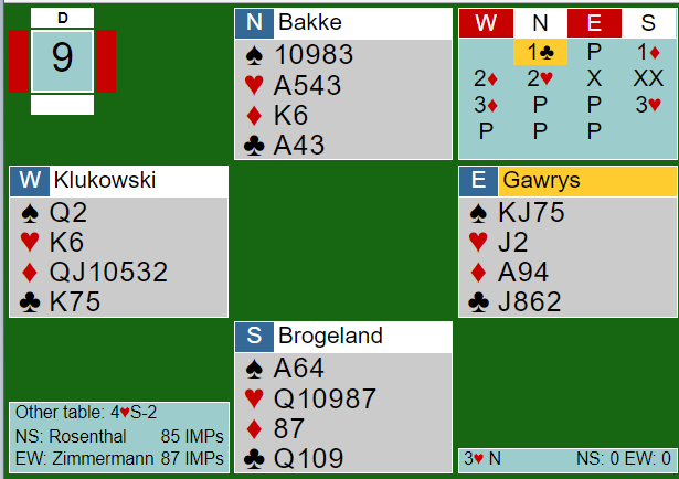 Bakke dro hjerter dame som vest dekket med kongen. Nord vant med esset og spilte mer hjerter til østs knekt. Han var inne i en ekkel situasjon og kunne altså ikke spille kløver. Han burde kanskje ha spilt spar nå, men siden han ikke så nords beholdning i spar og ruter, og makkeren som nevnt hadde meldt ruter ble det til at han spilte ruter ess. Neste ruter gikk til kongen og forsvaret hadde fått to stikk. Det ser fortsatt ut til å bli en bet med to spartapere og den ene kløvertaperen spillefører må få om han skal spille fargen selv. Men I den situasjonen – ruteren er eliminert og det er trumf på begge sider – utnyttet Bakke det lille forspranget han hadde fått pga. utspillet. Han spilte simpelthen spar til esset og mer spar, og motparten kunne ikke få tatt sparstikkene og fridd seg for å vente på kløverstikket. Hvis øst lar vest vinne med damen i andre sparrunde er han innspilt bare for å måtte spille kløver, eller ruter til dobbeltrenons slik at kløvertaperen forsvinner mens det trumfes på den andre siden . Hvis øst i stedet crusher vests sparhonnør (stikker over) blir det kjapt to spartapere, men øst som ikke kan spille kløver (og ruter er til dobbeltrenons) spiller i så fall god nords fjerde spar som gir kløveravkast. Det ble altså en fin liten +140 som sammen med +100 ga 6 IMP til ROSENTHAL. Som du ser i bildet over var det «fete» IMP på kampens daværende tidspunkt siden ZIMMERMANN før spillet ledet med 2 IMP.