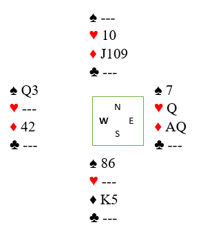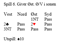 Etter standard Stayman har vest med disse meldingene fortalt om fire-korts spar (ellers ville han ikke brukt Stayman), og øst ville flyttet til sparkontrakt hvis han hadde hatt 4-4 i majorfargene. Vel vitende om fire spar hos vest spiller syd likevel ut spar som stikkes hos vest. Det er naturlig å gå på kløveren med liten fra vest. Idet åtteren kommer på kan spillefører få veldig god uttelling om han satser på en såkalt intrafinesse, dvs. legge nieren som krever knekten og senere dra damen som ruller opp fargen idet tieren faller. Da får han hele tre kløverstikk siden kongen blir fisket opp og tieren faller. Men å spille slik er bare riktig om det sitter spesifikt 10-8 dobbel. At kongen sitter andre, tredje eller fjerde hos nord er mye bedre sjanse. Så hvis det spilles med oddsen legges kløver dame som syd stikker med kongen. Nå har forsvaret en stopper til i kløver, men bare en. Idet spillefører kommer inn igjen med mer spar fra syd (stor spar) spilles best kløver ess som feller tieren, og mer kløver presser ut knekten. Kløver 6 har blitt til ett stikk. Spillefører har da 3+4+1+2=10 stikk. Inne på det andre kløverstikket er fortsettelse med en tredje spar beste motspill, hvis ikke kan syd bli utsatt for en skvis i ruter-spar for det ellevte stikket. Det vil bli mange som havner på ett overstikk her, men noen vil sikkert få fatt i elleve, og andre vil bare få ni stikk. Det er heller ikke helt usannsynlig noen som har etablert ti stikk går for enda et overstikk ved å ta ruterfinessen idet syd har fått godspilt to sparstikk. De er selvsagt farlig spill, men det er en mulighet for å tråkke feil, så det kan muligens bli noen få spillere som går bet i 3 grand også siden dette jo er parturnering. N/S: -630
