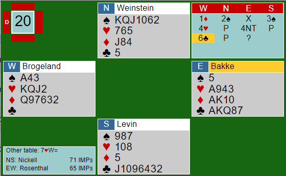 Det er absurd, og ingen bør være i nærheten av å melde slem her fordi det er en slem med særdeles dårlige sjanser. På onsdag ga +660 for 3 grand med elleve stikk delt nest topp, kun slått av et par som fikk inn +1100 mot en doblet kontrakt N/S.