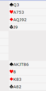 Syd valgte altså å hoppe til 3 spar. Nords 4 ruter og syds 4 hjerter var kontrollmeldinger (cuebids), og 4NT Roman Key Card Blackwood. Syd viste 0 eller 3 nøkkelkort, ikke 4 som jeg i halvsøvne skrev da jeg først postet dette innlegget før frokost... Poenget er imidlertid det samme, det må her være 3, dvs. nord "ser" syds A-K i spar og kløver ess. Nå kom 5 grand som er storeslemsinvitt og ber syd vise en konge hvis han har det. Syds 6 ruter viste kongen, og nord kunne telle til tretten stikk (Han kunne nok ha meldt 7 grand som er beste kontrakt, men...).