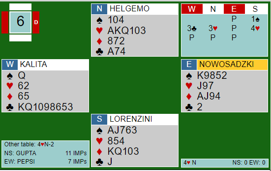Pepsi var også i 4 hjerter, og begge spilleførerne visste at vest satt med en og en halv meter med kløver. Pepsi sin spilleføring ser merkelig ut. Han også stakk kløverutspillet med esset og spilte kløver som øst trumfet med hjerter 9, samme start med andre ord. På sparskiftet fra øst la imidlertid polsk/amerikaneren liten fra syd. Det er kanskje mulig å finne sitser hvor det er riktig, men her ramlet taket i hodet på han. Vest stakk med sin single spar dame og spilte kløver som øst kunne stjele siden han hadde høyere trumf enn bordet (syd) og nord fulgte med kløver. Øst tok så for ruter ess - en bet - og sikret den andre beten ved så å spille spar som vest kunne stjele. Pluss 100 sammen med Helgemo sin +420 var verd 11 IMP for GUPTA.