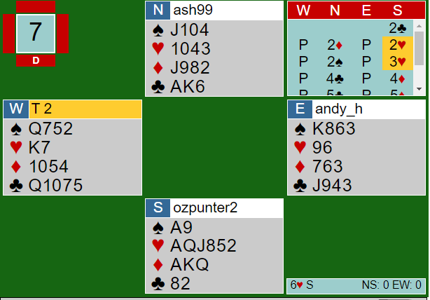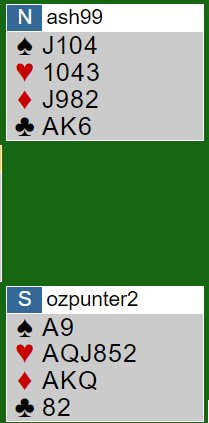 Kl A fulgt av kl K tok de to første stikkene og Syd fikk blakket seg i hjerter. Tredje kløver kunne Syd stjele, ru 10 vant jeg med damen og alt som etter det var mulig å hente var stikk for ru J samt et stikk i spar da de til slutt måtte åpne den fargen for meg. 4 doblete bet, -1100 som kostet 14,3 imp og ras nedover på premieskalaen fra 1. til 18. plass. Hevnen var søt altså! Men slikt kan også skje, ved andre bord introduserte nok Syd ruter fargen sin fra start må tru? Opp og nedturer hører med i konkurransebridge og må tas med godt humør.
