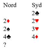 Nord åpnet med 1 ruter og Arne gikk innpå med 1 spar. Dobling, negativ som lover 4+ hjerter fra Syd, pass fra Nico og gjenmelding 2 ruter fra Nord. Da Syd etter pass fra Øst meldte 2 spar var det krav og Nord besvarte med 2 grand som lovte hold i spar. Syd la deretter på til 3 grand.