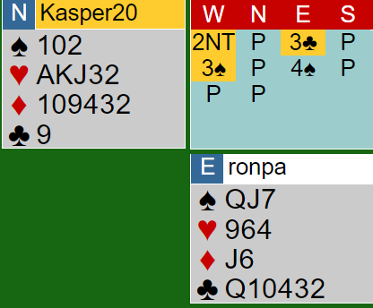 Ved det andre bordet spilte vest 3NT. Nord spilte ut stor hjerter. Nå er det to bet om nord skifter til ruter. Syd vinner med esset, og hjerter gjennom gjør at forsvaret får fem hjerterstikk pluss ruter ess. Nord fant imidlertid ikke det motspillet. Han dengte ned den andre store hjerteren i håp om damen dobbel hos vest, men da stod 3NT!