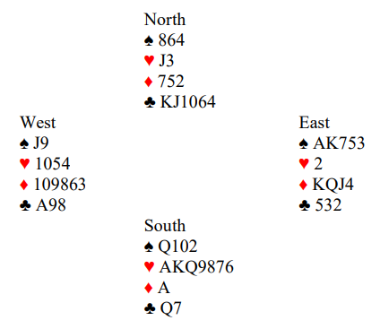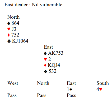 Vest spiller ut ruter. Det utspillet er litt kjedelig for spillefører, for nå er det problemer om hjerteren sitter 4-1. Med et annet utspill kunne du for eksempel løst 4-1 i trumf med knekten fjerde hos øst uten taper ved å spille konge-dame i trumf, så finesse med tieren idet det eventuelt oppdages at vest ikke har trumf i fargens andre runde. Deretter kan den fjerde trumfen tas ut, så stikkes ruter konge over med esset, og det er nok stikk.