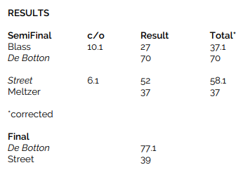 Idet du nå får presentert alle fire hendene er det vanskelig å se for seg hvordan det skal kunne gå an å gå bet i 7 hjerter. Men vest var i form, først traff han ruter i utspill som ødela forbindelsen mellom hendene i den fargen, så la han den lumske fellen da han la på hjerter knekt i fargens første runde. Siden spillefører tok vest hjerter knekt «at face value» gikk det galt. Idet han gikk i gang med ruteren for å presse østs antatte fire trumf fra start kunne vest trumfe med toeren i tredje ruterrunde – en nitrist bet!