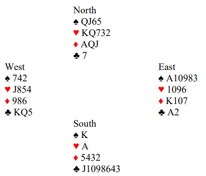 Å ha to ess mot slem skjer av og til, men to ess mot storeslem? Å spille ut esset i den korteste fargen har størst sjanse for ikke å bli trumfet, og Michael prøvde ruter ess. Slik så hele spillet ut: