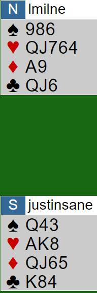 Ved det andre bordet tenkte syd i samme baner som Donner, men der valgte han hjerterutspill. Da ble det ti stikk og 12 IMP ut for han som bommet i valget mellom majorfargene.
