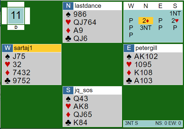Hvis syd spiller ut liten spar er det ikke så enkelt for N/S å finne motspillet. Da må nord elegant legge liten i første stikk slik at N/S beholder overgang til sparstikkene med esset og en til idet syd er inne på kløver ess. Det er lett å si at det er riktig å la spillefører vinne første stikk etter liten spar ut fra syd når man ser alle kortene. Men nord vet ikke at syd har kløver ess, og å legge liten kan bli veldig galt om syd har spilt ut fra for eksempel A-J fjerde. Legges liten spar fra nord i første stikk - som altså er helt nødvendig her - kan det det godt hende spillefører etter å ha fått forært stikket for sin dame dobbel rasker sammen ni stikk mens forsvaret kunne tatt fem sparstikk med det samme.