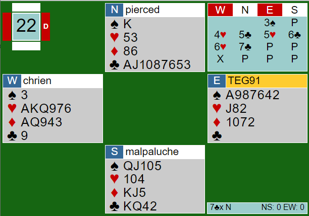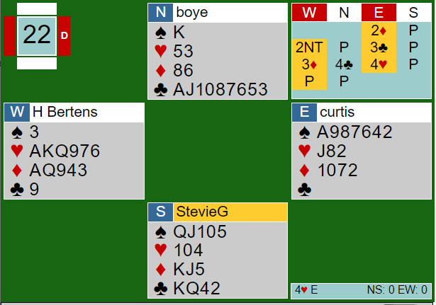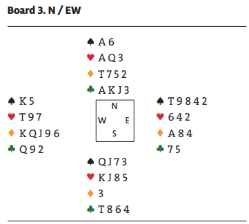 Ved dette bordet meldte syd 2 kløver over nords 1 grand i andre runde. Meldingen ble ikke altertert, og det er ukjent om de visste helt hva de dreve med? Hvis det var omtrent som XY så må jo nord melde 2 ruter, men om det er Check Back ville han sagt 2 hjerter. Da kunne de kanskje funnet den bedre utgangen 4 hjerter, for 3 grand er som du ser bet med ruter ut.
