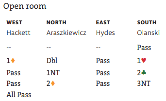 Merk Charlsens 2 kløver som svar på doblingen. Det viser en invitthånd (normalt 8-9 til 11) med begge major. Det har han til, i majorkontrakt er vel hånden ca. 10 poeng. Og det er jo veldig sannsynlig dobleren har en majorfarge. Over 2 kløver avsluttet Hoftaniska med 3 grand.
