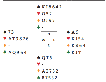 Vel, det var ikke over helt, for husk at vest ikke ser nord sine kort. Idet ruter knekt vant første stikk hadde Hackett et problem. Hvis han spiller en stor ruter i andre stikk (for eks. kongen) blokkeres ruteren hvis ikke øst stikker over! Og om øst stikker over blir nords ruter 10 stopper. Mange spiller jo ut liten fra tre små i makkers farge (og nord A10xx), og om øst har det kan liten ruter tilbake koste stikk. Hackett brukte en del tid før han spilte ut til andre stikk, men til slutt spilte han liten ruter tilbake. Øst måtte da bruke esset, ikke åtteren som han kunne vunnet med (blokkerer i så fall med esset singel gjenværende). Han fant det motspillet, stakk med esset og de fikk fatt i fem ruterstikk - en bet.