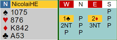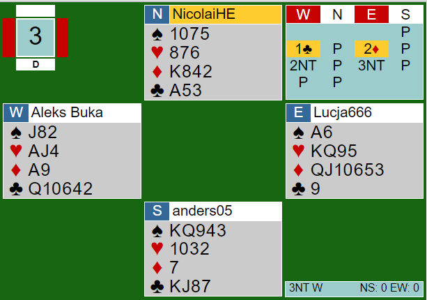 Med godt bridgevær, surt og fuktig ble det kraftig økning i deltakelse på tirsdagens sommerbridge. 38 par etter to svake kvelder i tropevarmen sist i juni. Her et vanskelig spill der salen var i 3 NT av Nord. Skjul Ø-V sine kort og følg spillet Lars Helgesen i Nord presterte. Han hadde åpnet i ugunstig sone med 1 kløver (3+), Øst gikk innpå med 2 hjerter, svake 2, og Tom Gjøs meldte 3 ruter med avslutning 3 NT av Helgesen.