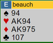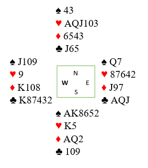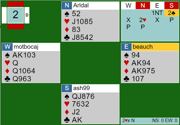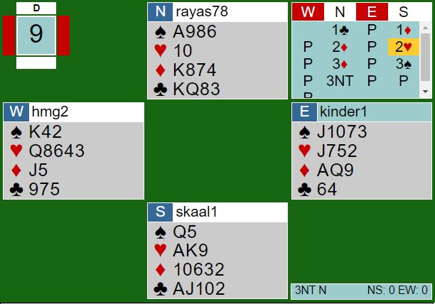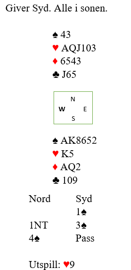 (Det er riktig som noen kansje har oppdaget at kontrakten går bet om det kommer to ganger kløver ut fulgt av ruterskift fra øst, fordi ruter konge sitter bak. Men det motspillet slipper man altså hvis vest ikke unaturlig spiller ut sin single hjerter. Og da er det veldig synd å gå bet fordi timingen blir feil, og det blir faktisk etter hjerter ut, to runder trumf og så i gang med hjerteren bet selv om ruter konge sitter i saksen!)