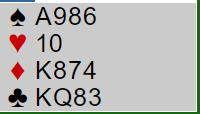 Du vinner også her med hjerter konge og spiller A-K i trumf og registrerer at begge motspillerne følger farge to ganger. Spillet er ikke særlig forskjellig fra det forrige eksempelet, men bør du også her spille en tredje runde trumf for å gi dem det trumfstikket som de uansett må få for? Gjør du det har du jo (minst ti sikre stikk).